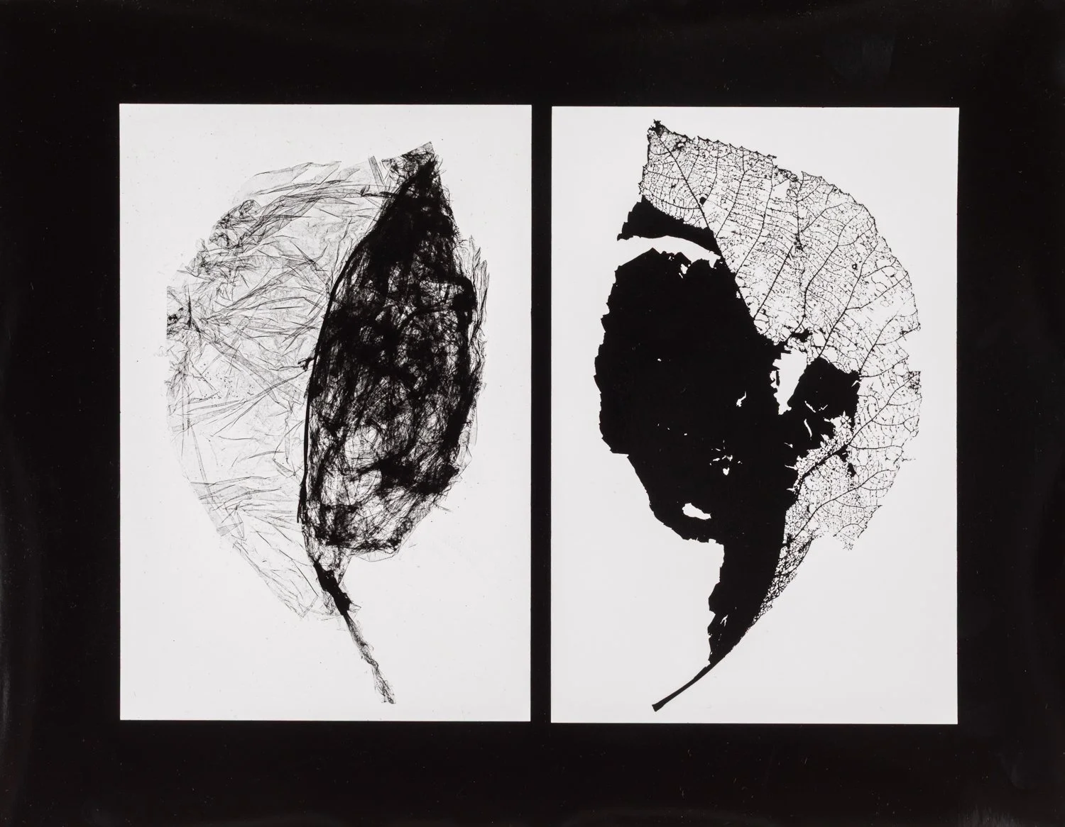 My cliché verres are made by extending the image making process outward by placing soot-covered plates in wooded areas for various durations of time. This results in markings in the soot made by wind, moisture, insects, and animals. The plates are then contact printed or pressed onto paper, transferring a menagerie of ephemeral marks and gestural patterns. 2018-present